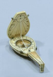 La partie supérieure du cadran, avec magnifique décor de mandoline, s’ouvre et laisse découvrir un cadran solaire vertical numéroté VI-XII-VI.