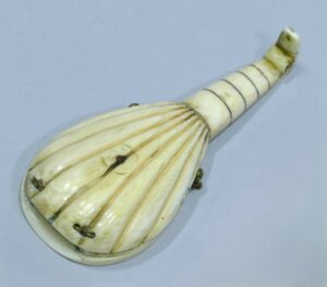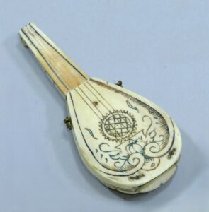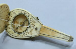 Notre collègue M. Delalande nous propose un cadran solaire en ivoire légèrement polychrome en forme de mandoline.